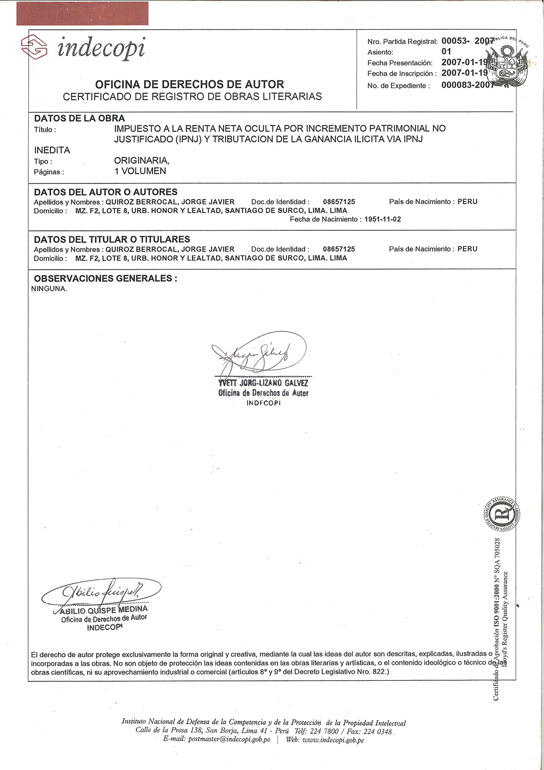 Jorge Quiroz Berrocal, ha publicado su primera obra, calificada como inédita en el Perú y América Latina, titulada “Impuesto a la Renta Oculta por Incremento Patrimonial No Justificado (IPNJ) y Tributación de la Ganancia Ilícita vía IPNJ”
